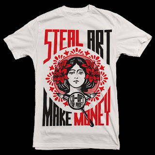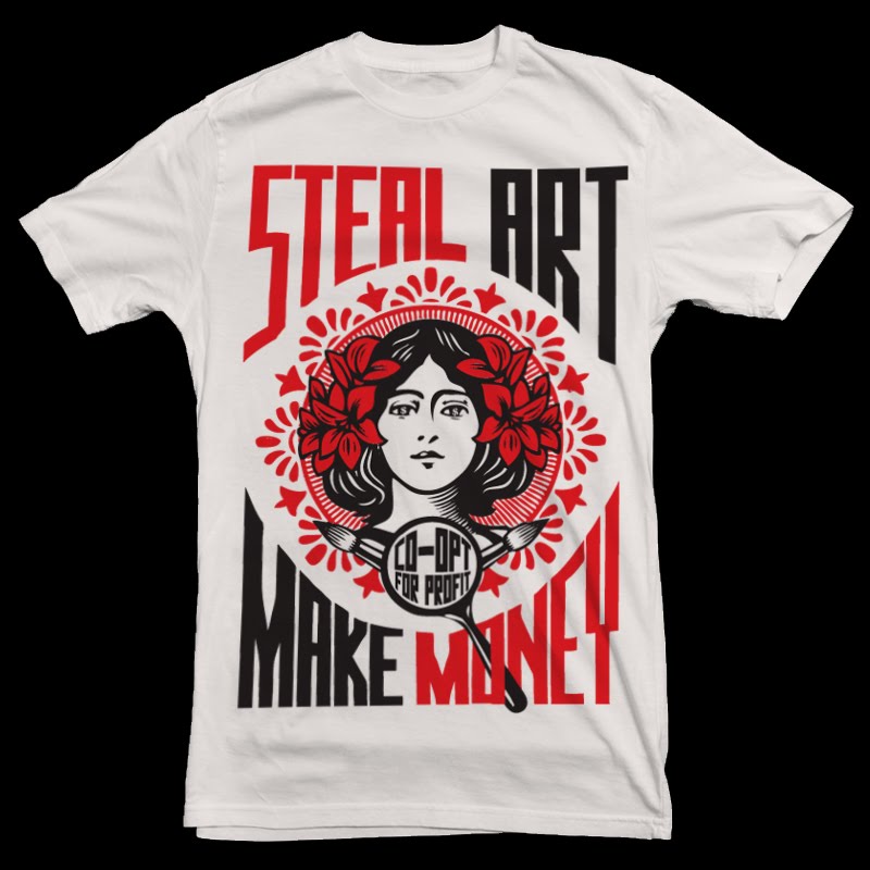 Shepard Fairey and his Obey brand has been hailed as revolutionary street art and the premier purveyor of proletarian products. Fairey has been exposed as a blatant plagiarist and fraud – who has no consideration for the origin or meaning of the images he expropriates. Not only does he take the work of others, slap his logo and colors and patterns on it and call it his own, he strips it of all significance it once held. This is a tragedy since he typically preys on images which have tremendous meaning in the histories of popular resistance and struggles for social justice.